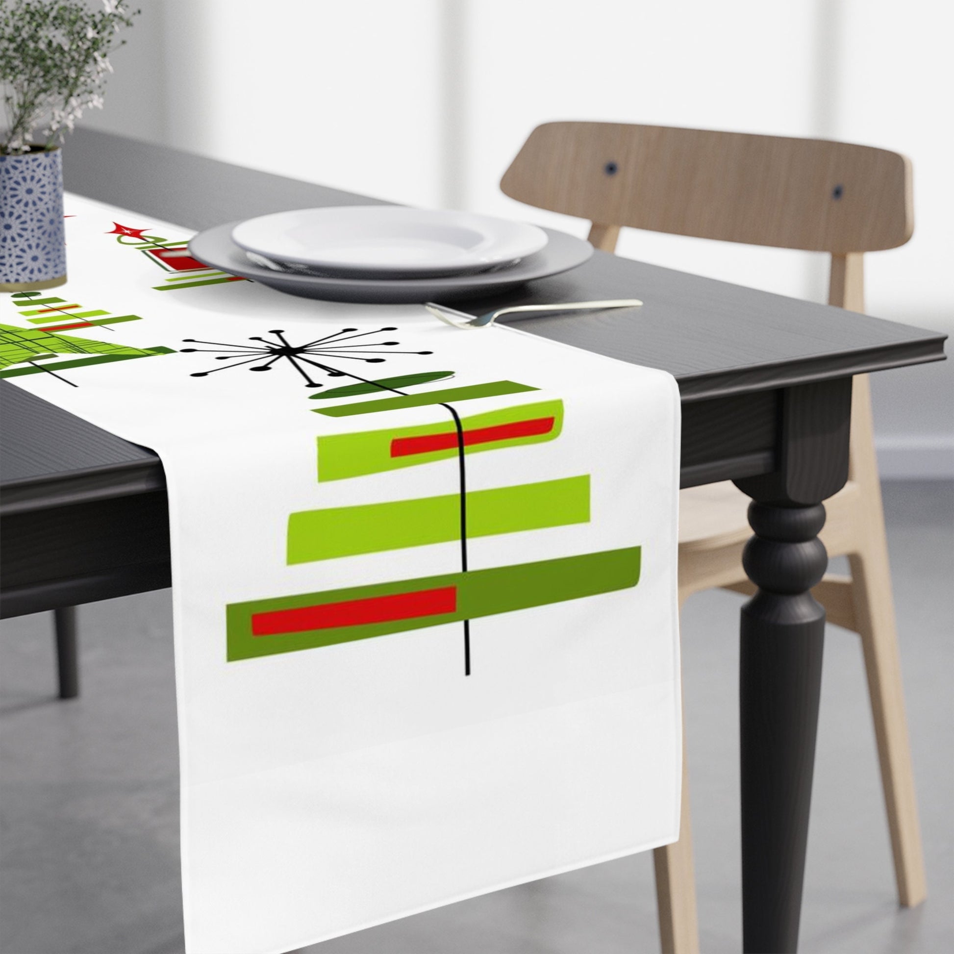 Christmas Holiday Table Runner Mid Century Modern White Tinsel Trees