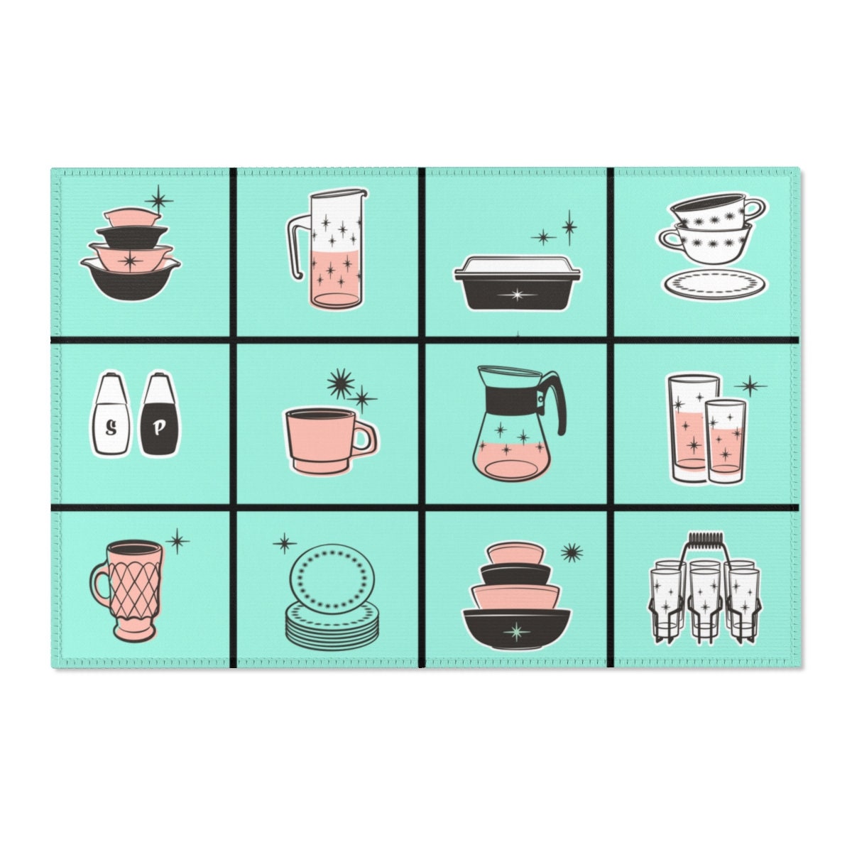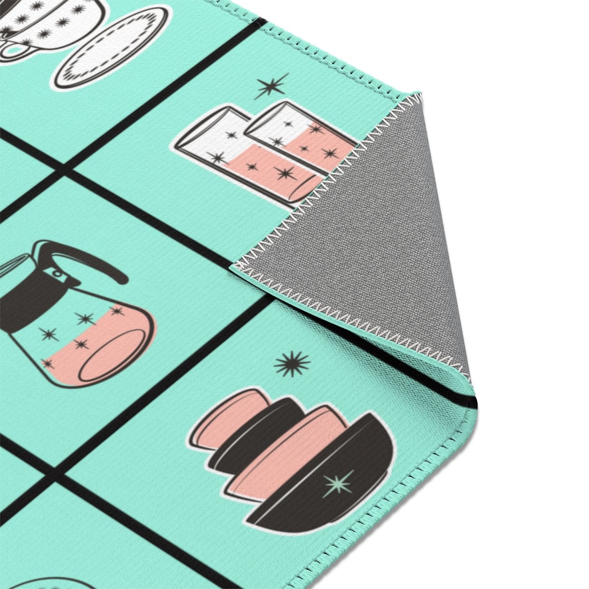 MCM Mid Century Modern Retro Kitchen Rug Vintage 50s Cookware Blue